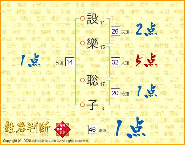 生活面を象徴する運勢です。外部から受ける影響力を表し、結婚運、家庭運や職場、環境への順応性を表します。総運から人運を引いた画数。姓や名が1文字の場合を除く。