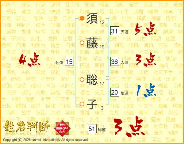 あなたの人生を表す1番重要な運勢です。生涯を通じて影響する総合運となり、主に50歳以降の晩年期に影響を及ぼします。苗字と名前の合計画数。
