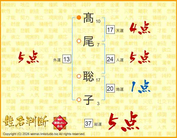 髙尾聡子さんの総運は37画の5点!