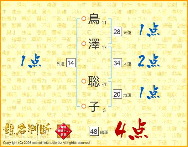 鳥(11画)澤(17画) 聡(17画)子(3画)