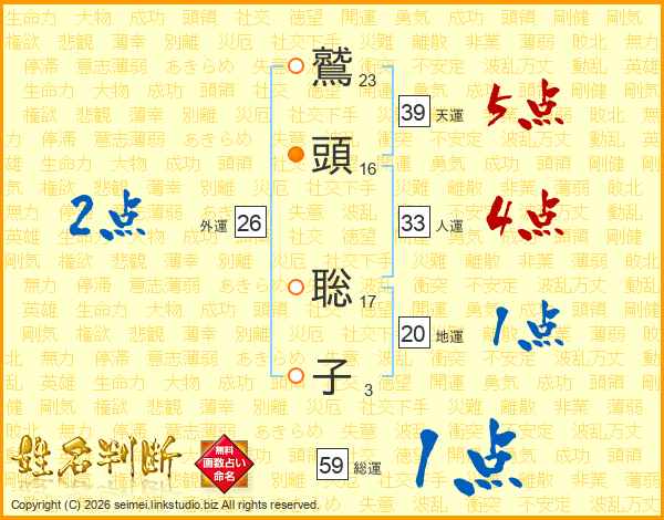 鷲(23画)頭(16画) 聡(17画)子(3画)