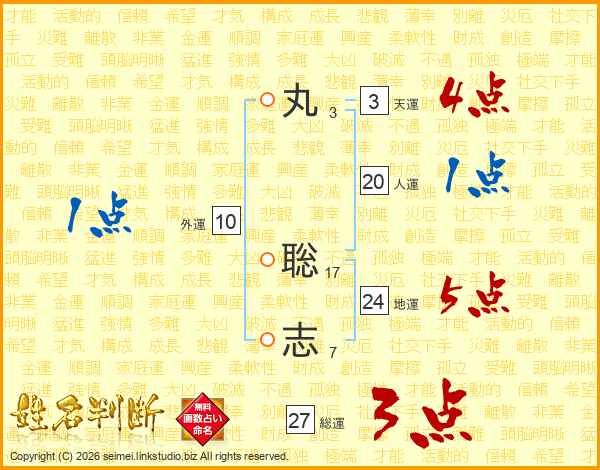 生活面を象徴する運勢です。外部から受ける影響力を表し、結婚運、家庭運や職場、環境への順応性を表します。総運から人運を引いた画数。姓や名が1文字の場合を除く。