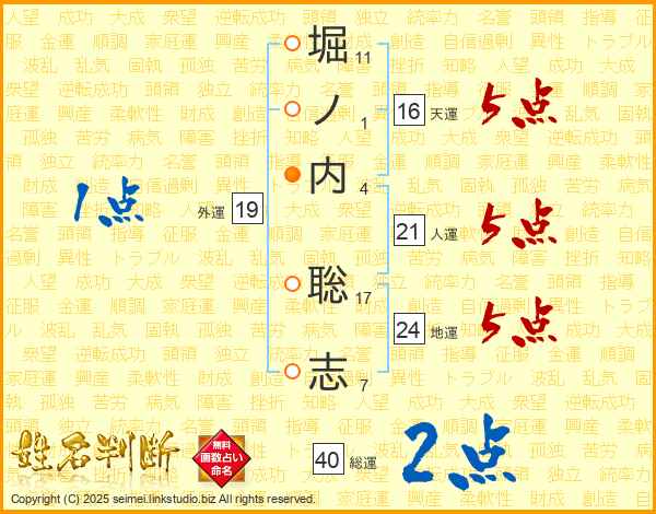堀(11画)ノ(1画)内(4画) 聡(17画)志(7画)