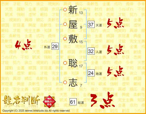 新(13画)屋(9画)敷(15画) 聡(17画)志(7画)