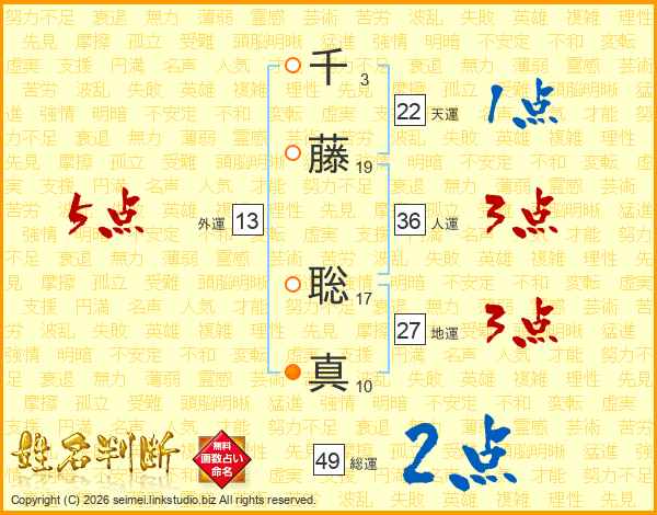 千(3画)藤(19画) 聡(17画)真(10画)