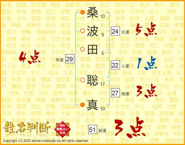 桑(10画)波(9画)田(5画) 聡(17画)真(10画)