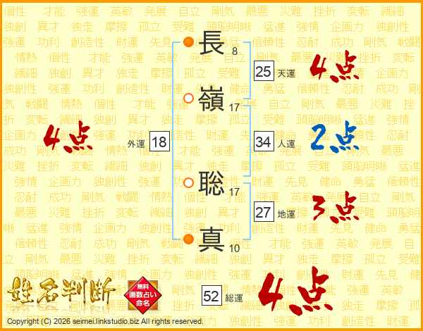 長(8画)嶺(17画) 聡(17画)真(10画)