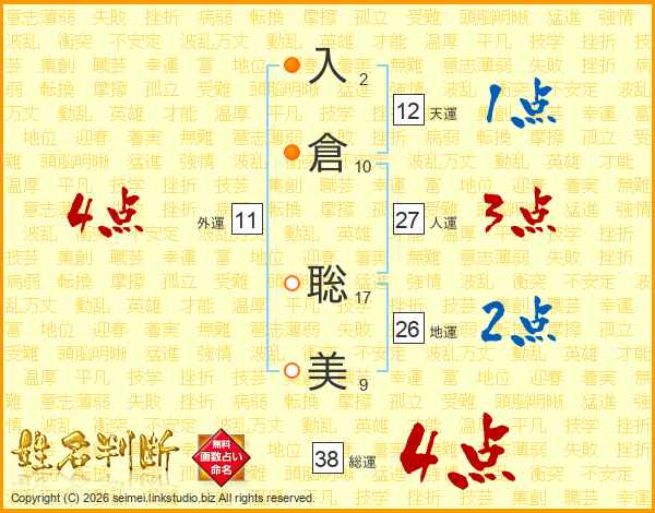 入(2画)倉(10画) 聡(17画)美(9画)