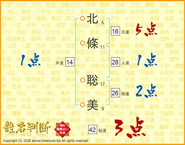 生活面を象徴する運勢です。外部から受ける影響力を表し、結婚運、家庭運や職場、環境への順応性を表します。総運から人運を引いた画数。姓や名が1文字の場合を除く。