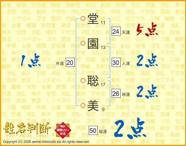 堂(11画)園(13画) 聡(17画)美(9画)