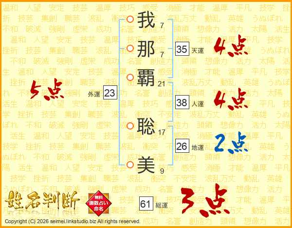 我(7画)那(7画)覇(21画) 聡(17画)美(9画)