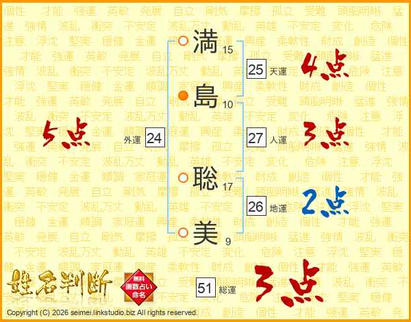 満(15画)島(10画) 聡(17画)美(9画)