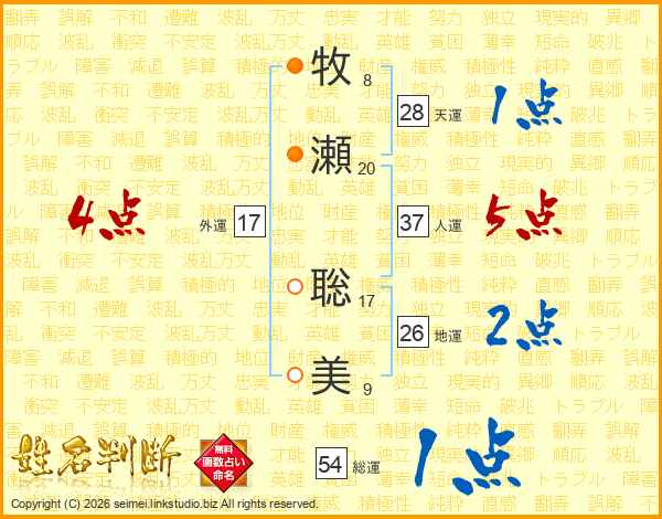 牧(8画)瀬(20画) 聡(17画)美(9画)