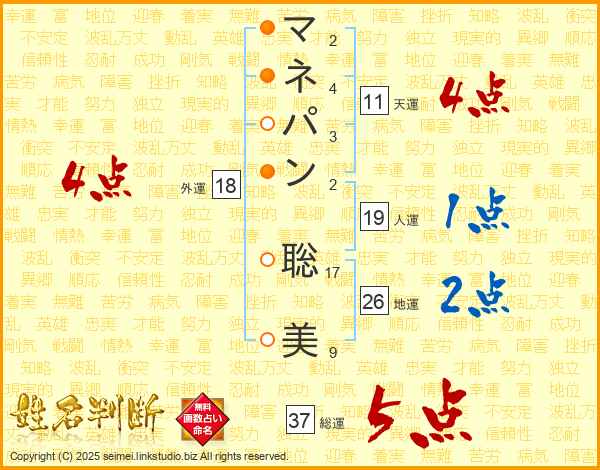 マ(2画)ネ(4画)パ(3画)ン(2画) 聡(17画)美(9画)