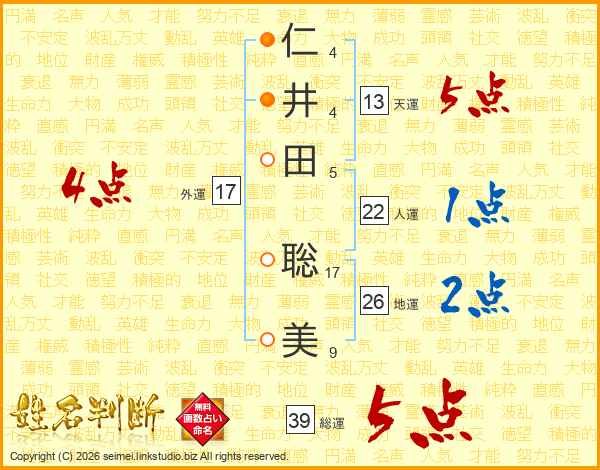 仁(4画)井(4画)田(5画) 聡(17画)美(9画)