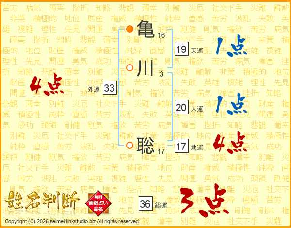 亀(16画)川(3画) 聡(17画)