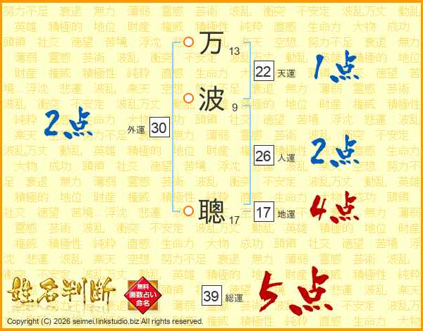 生活面を象徴する運勢です。外部から受ける影響力を表し、結婚運、家庭運や職場、環境への順応性を表します。総運から人運を引いた画数。姓や名が1文字の場合を除く。