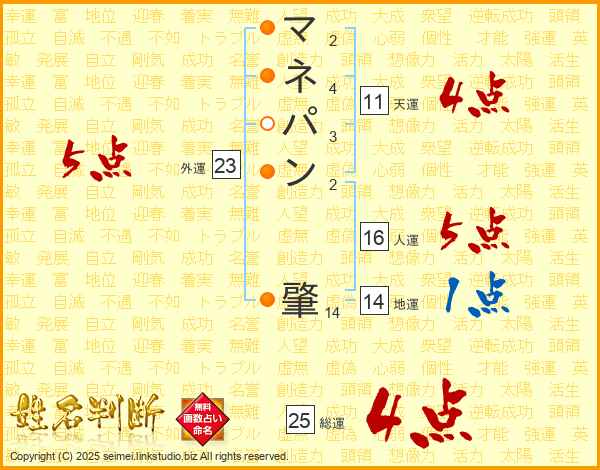 生活面を象徴する運勢です。外部から受ける影響力を表し、結婚運、家庭運や職場、環境への順応性を表します。総運から人運を引いた画数。姓や名が1文字の場合を除く。
