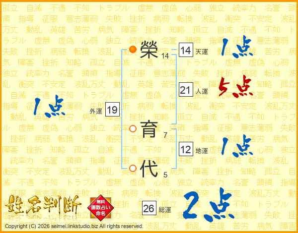 生活面を象徴する運勢です。外部から受ける影響力を表し、結婚運、家庭運や職場、環境への順応性を表します。総運から人運を引いた画数。姓や名が1文字の場合を除く。