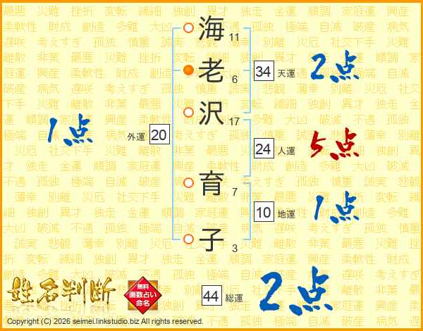 海(11画)老(6画)沢(17画) 育(7画)子(3画)