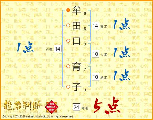 牟(6画)田(5画)口(3画) 育(7画)子(3画)