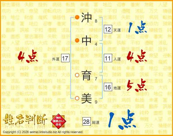 沖(8画)中(4画) 育(7画)美(9画)