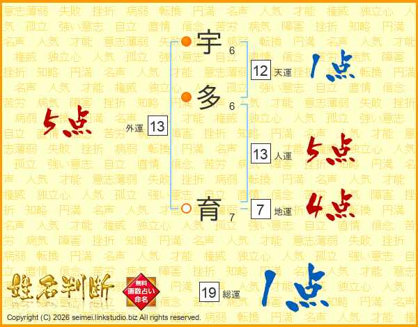 生活面を象徴する運勢です。外部から受ける影響力を表し、結婚運、家庭運や職場、環境への順応性を表します。総運から人運を引いた画数。姓や名が1文字の場合を除く。