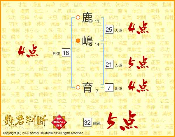 鹿(11画)嶋(14画) 育(7画)