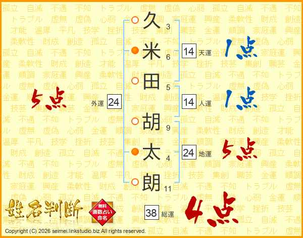 久(3画)米(6画)田(5画) 胡(9画)太(4画)朗(11画)