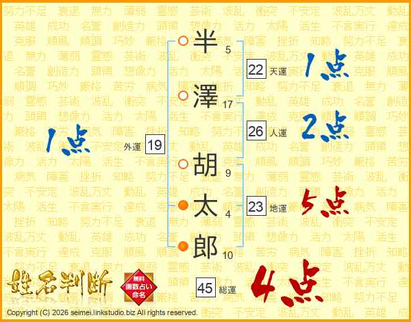 半(5画)澤(17画) 胡(9画)太(4画)郎(10画)