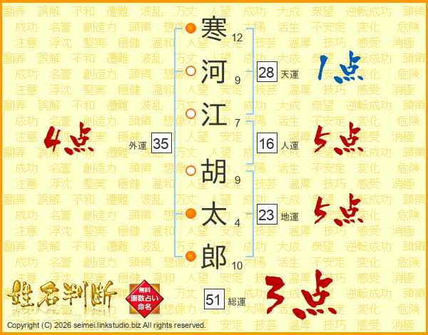寒(12画)河(9画)江(7画) 胡(9画)太(4画)郎(10画)