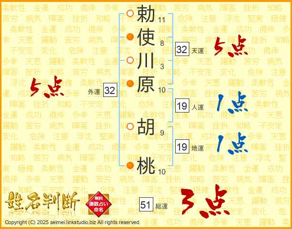 勅(11画)使(8画)川(3画)原(10画) 胡(9画)桃(10画)