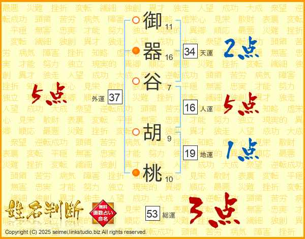 御(11画)器(16画)谷(7画) 胡(9画)桃(10画)