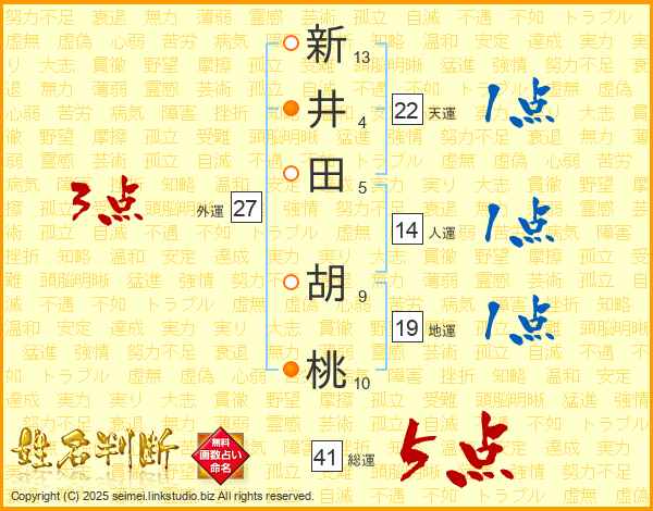 新(13画)井(4画)田(5画) 胡(9画)桃(10画)