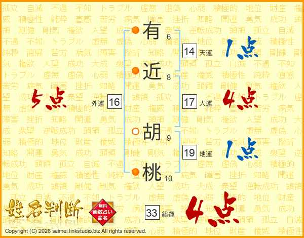 生活面を象徴する運勢です。外部から受ける影響力を表し、結婚運、家庭運や職場、環境への順応性を表します。総運から人運を引いた画数。姓や名が1文字の場合を除く。
