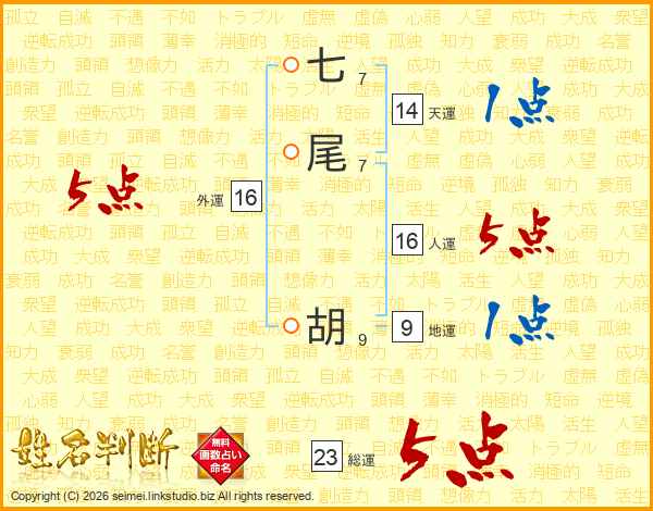 七尾胡さんの総運は23画の5点!