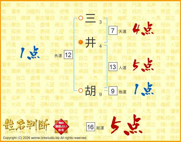 三井胡さんの総運は16画の5点!