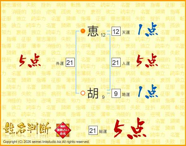 あなたの人生を表す1番重要な運勢です。生涯を通じて影響する総合運となり、主に50歳以降の晩年期に影響を及ぼします。苗字と名前の合計画数。