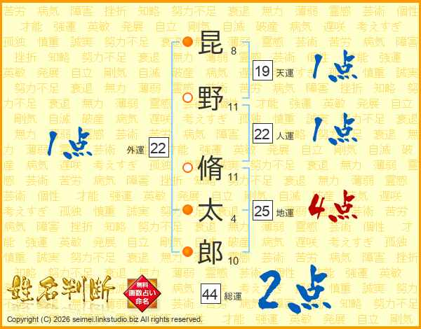 昆(8画)野(11画) 脩(11画)太(4画)郎(10画)