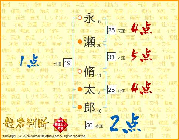 永(5画)瀬(20画) 脩(11画)太(4画)郎(10画)