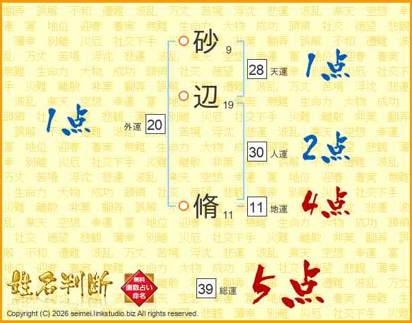 砂辺脩さんの総運は39画の5点!