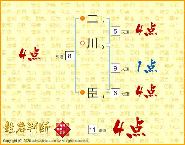 生活面を象徴する運勢です。外部から受ける影響力を表し、結婚運、家庭運や職場、環境への順応性を表します。総運から人運を引いた画数。姓や名が1文字の場合を除く。