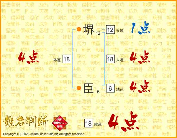 生活面を象徴する運勢です。外部から受ける影響力を表し、結婚運、家庭運や職場、環境への順応性を表します。総運から人運を引いた画数。姓や名が1文字の場合を除く。