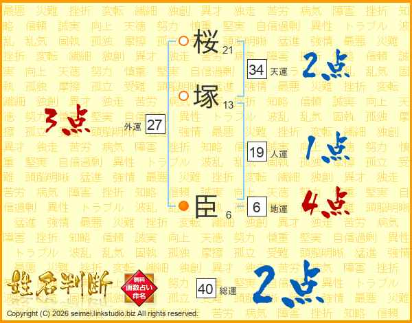 桜(21画)塚(13画) 臣(6画)