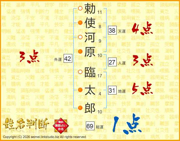 勅(11画)使(8画)河(9画)原(10画) 臨(17画)太(4画)郎(10画)