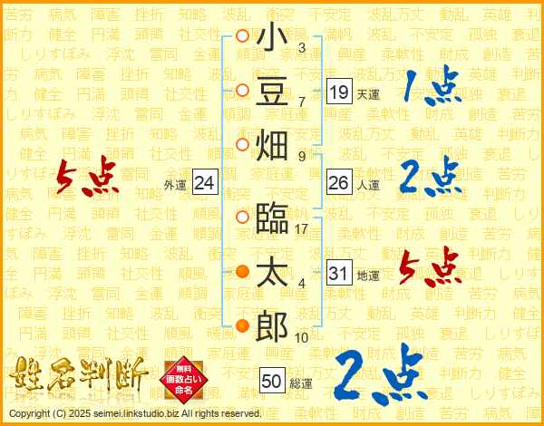 小(3画)豆(7画)畑(9画) 臨(17画)太(4画)郎(10画)