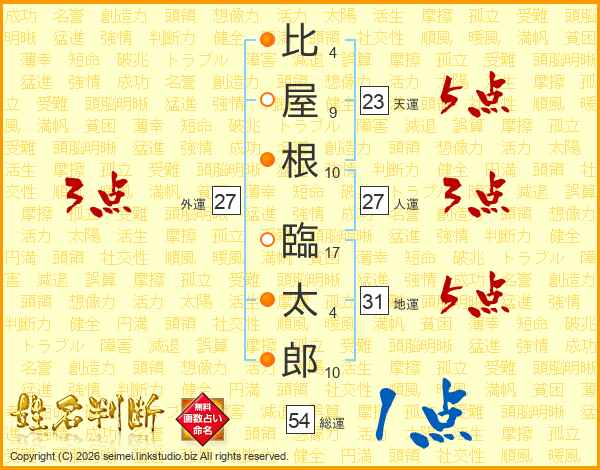 比(4画)屋(9画)根(10画) 臨(17画)太(4画)郎(10画)