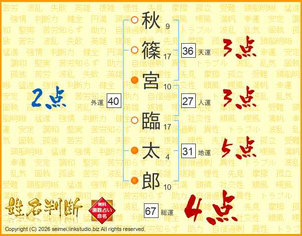 秋(9画)篠(17画)宮(10画) 臨(17画)太(4画)郎(10画)