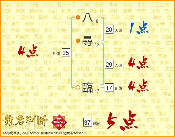 生活面を象徴する運勢です。外部から受ける影響力を表し、結婚運、家庭運や職場、環境への順応性を表します。総運から人運を引いた画数。姓や名が1文字の場合を除く。