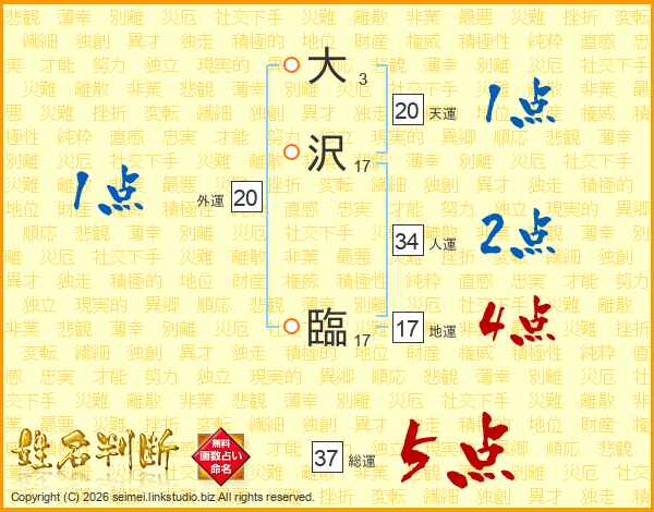大沢臨さんの総運は37画の5点!